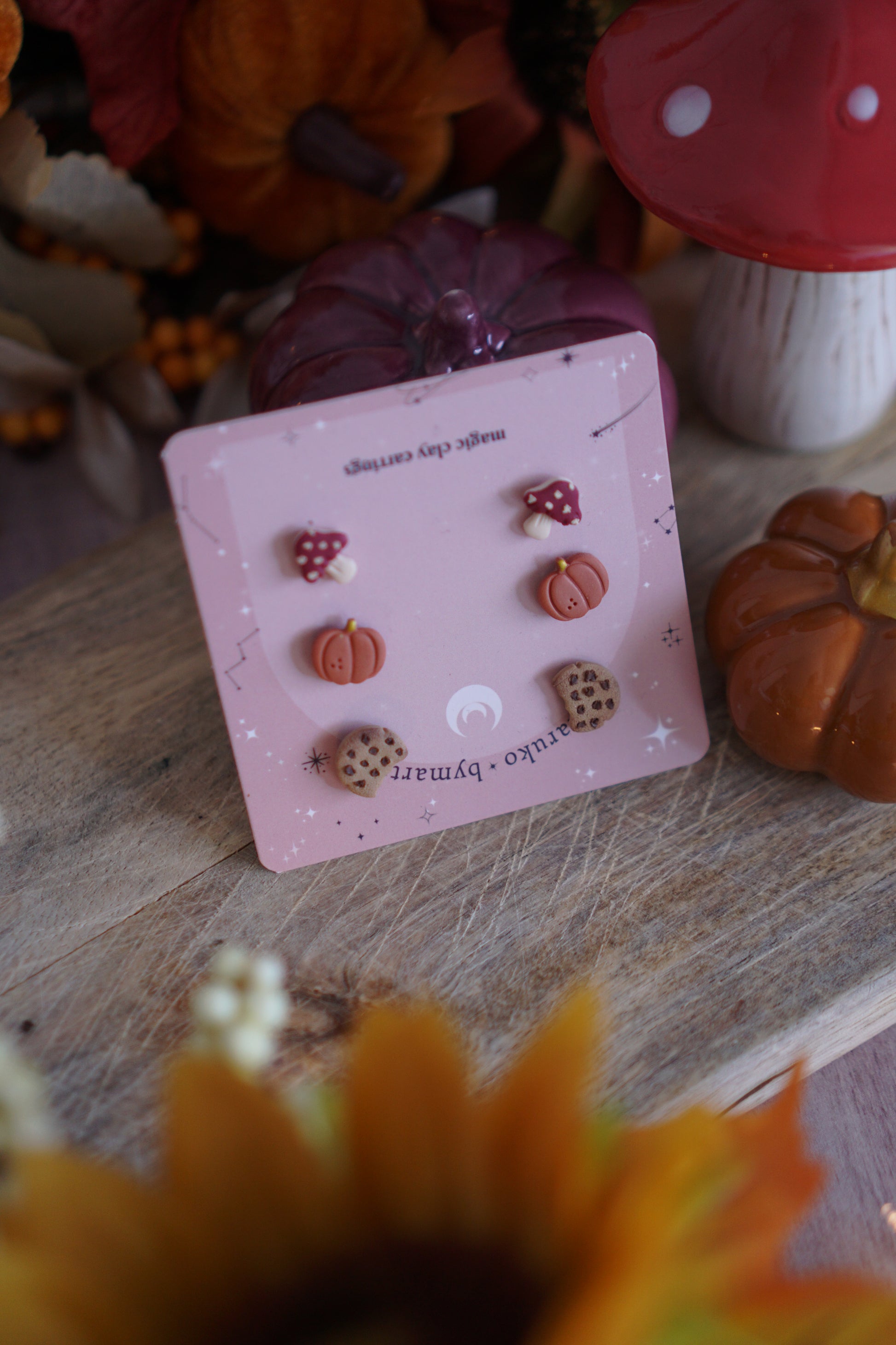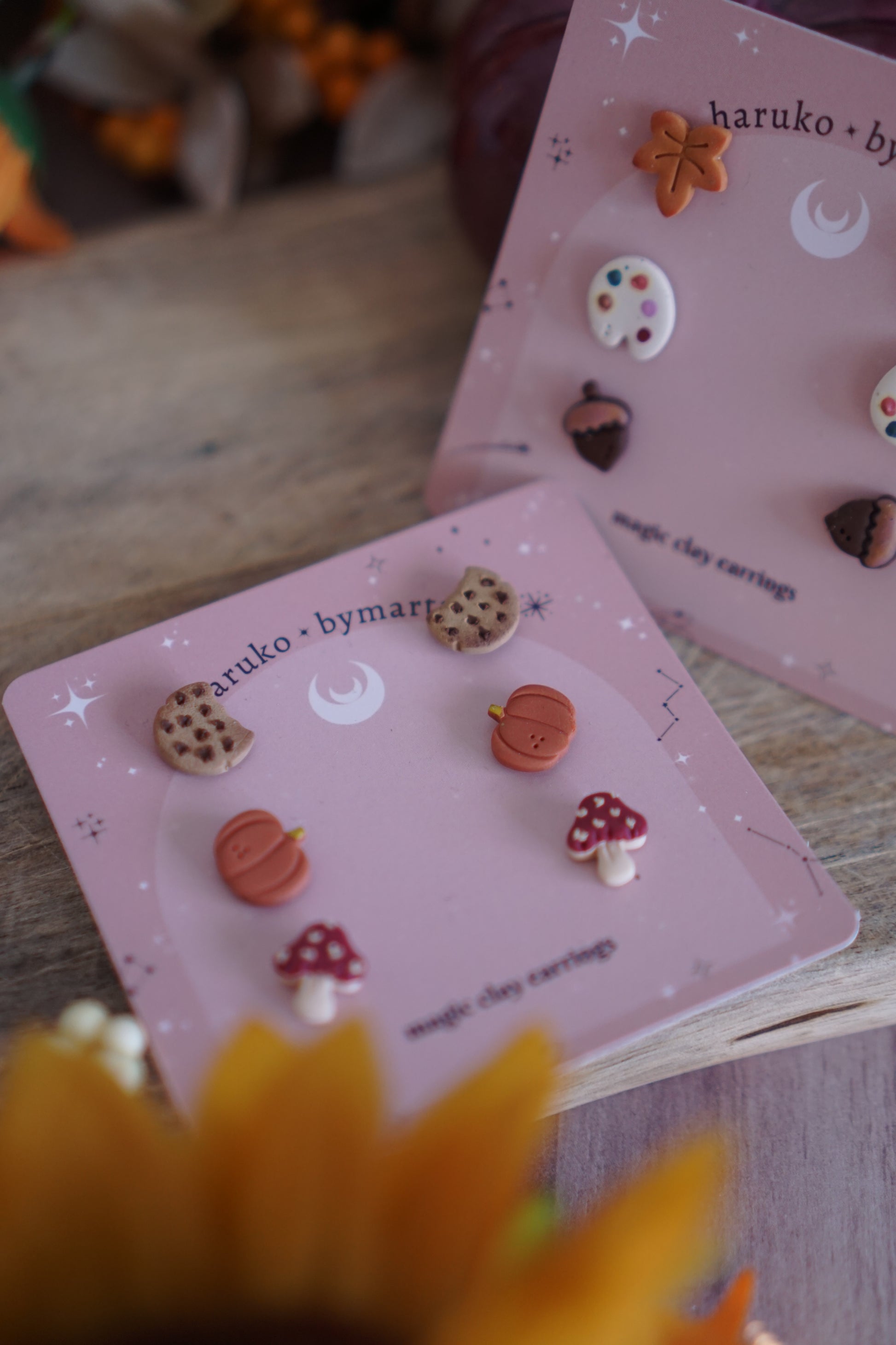 Es un PACK DE TRES, puedes elegir entre varios modelos: seta, calabaza, hoja naranja, hoja verde, paleta de pintor, bellota, ardilla, cookie... déjamelo en notas del pedido los tres pares elegidos.