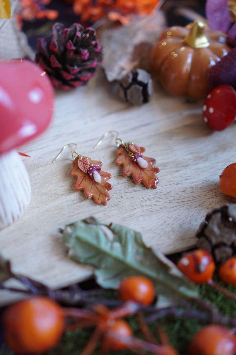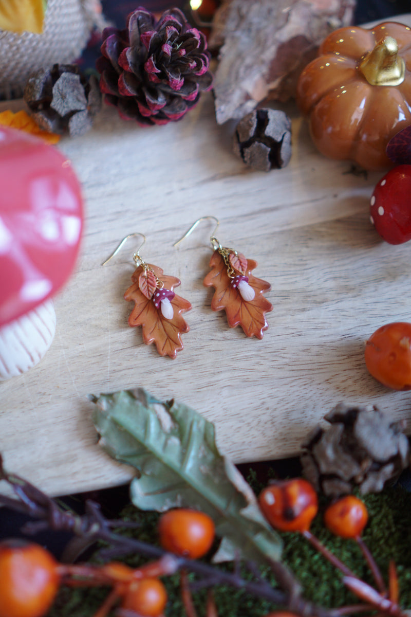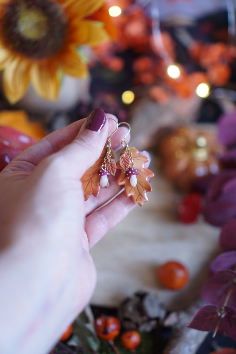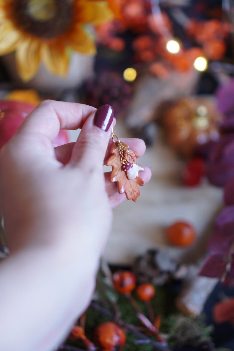 MEDIDAS aprox de la pieza de arcilla: 4cm largo. Puedes elegir entre acabado brillante de la hoja o mate. Los pendientes tienen una hojita pequeña colgando que puede variar en tonos (entre los verdes y naranjas) debido a su naturaleza hecha a mano.